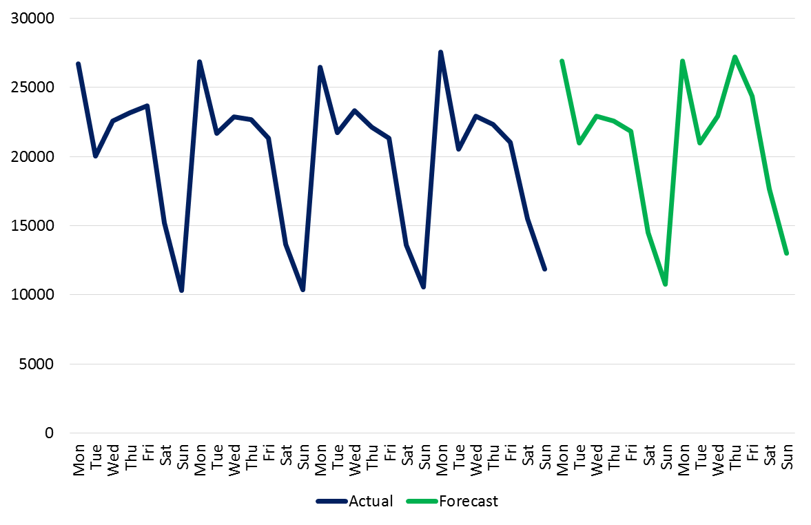 A visual representation of forecasts versus recent actuals serves as a powerful tool in discussions with stakeholders. By using charts alongside documented assumptions about future variation, you can facilitate clearer communication, build transparency, and ensure alignment across teams. Charts also allow you to demonstrate different scenarios (eg the uncertain outcome of automation initiatives), enabling more informed discussions on resource planning.